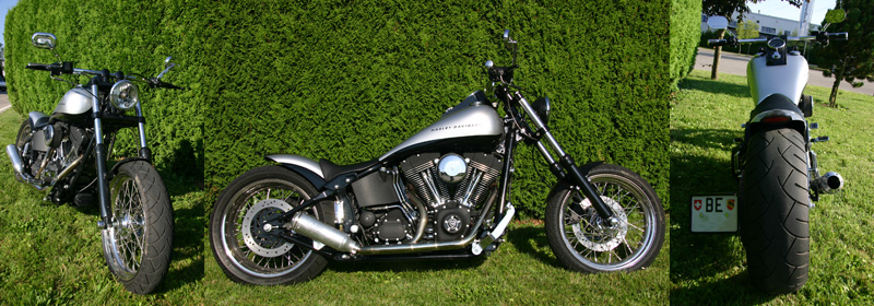 FXSTBI SilverBlack - Custom Heck mit integriertem Rücklicht - 200er in original Schwinge, auf 18" Speichenrädern - Kesstech Shorty 2in1 Auspuffanlage - Twin Tec Seitennummer-Halter - Strech-Tank, Dragbar und Solosattel Details: D1 |