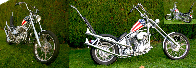 VERKAUFT - Replica von Peter Fonda's Bike aus Easy Rider - 1950er HD Pan Head, 1996 in über 150 Stunden komplett umgebaut - Belege für mehr als 60'000.- ... dazu gibt's noch original eingeschweisste Magazine mit Reportagen über das Bike. |