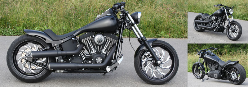 2008 NighTrain FatBlack ... Neben der der geduckten und und agressiven Gesamterscheinung, die durch die Twin Tec Blecharbeiten entstanden ist, fallen die gefrästen PM-Räder sofort ins Auge. Die Torque-Design Räder sind im so genannten cut-out Verfahren gefertigt und in Verbindung mit der Driveside Bremse inkl. dazu passenden Bremsscheiben so ziemlich das 'coolste' was der Markt zu bieten hat. Ansonsten wurden viel Twin Tec Parts wie z.B der seitliche Kennzeichenhalter oder der Luftfilter verbaut und das ganze wie gewohnt in 'freundlichem schwarz' Detailbilder: D1 D2 |