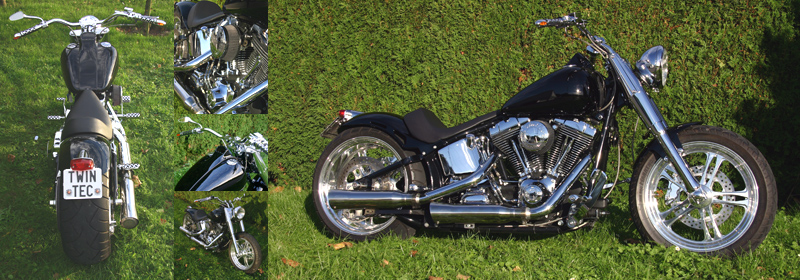 2003 Softail 240 - 240er Heckumbau mit PM Rädern - Digitaltacho in Tank integriert, Solositz - BSL-Auspuffanlage und BigSucker Luftfilter - komplettes Chrome Kit, inkl. Fatboy Gabel |