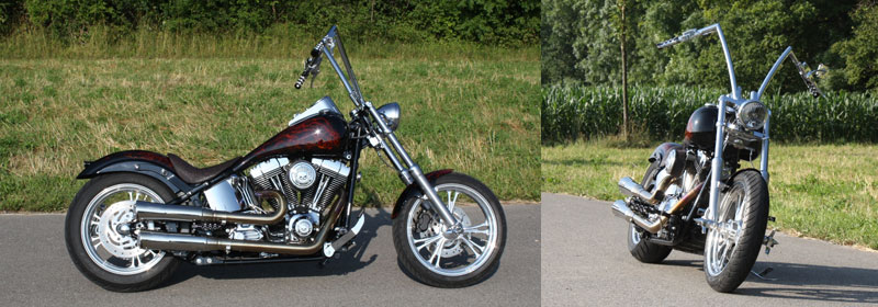 Softail - Steinbock Bike aufgebaut von Arni Harley-Davidson in Hessikofen, Lenker und Auspuffanlage von Twin Tec - Twin Tec Lenker, alles innenverlegt - PM Armaturen, Hydraulikkupplung - Auspuff Kess-Tech mit EU ABE - Original Tank, verlängert Detailbilder: D1 D2 |